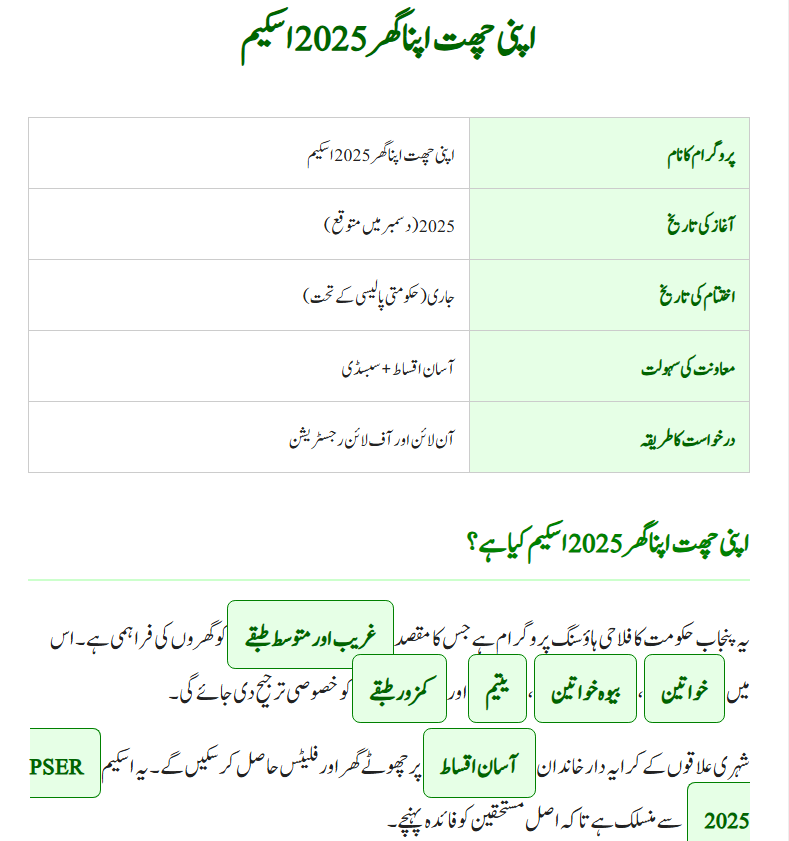 The Apni Chat Apna Ghar 2025 Scheme by CM Punjab Maryam Nawaz is a historic initiative for poor and middle-class families. With easy installments, transparent registration through PSER 2025, and a special focus on women, this scheme provides new hope to thousands of families in Punjab.