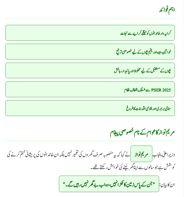 The program will reduce the financial burden of high rent in cities, offering families small houses and apartments on affordable installments. To ensure fairness, eligibility is verified through the Punjab Socio-Economic Registry (PSER 2025) database so that only genuine deserving families benefit.
