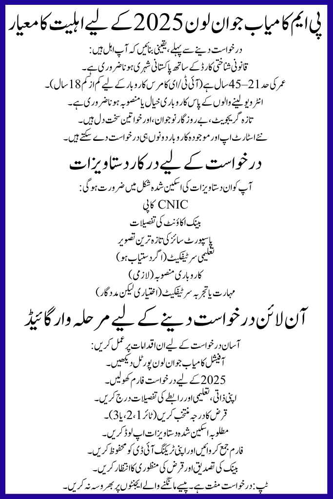 In Pakistan, many new people face difficulties in starting their own trades due to financial glitches. To resolve this issue, the government has launched the PM Kamyab Jawan Loan 2025, a program made for childhood to get easy advances for startups and small businesses. This guide explains all you essential to know — suitability, required documents, loan groups, and by what means to apply online stage by step.