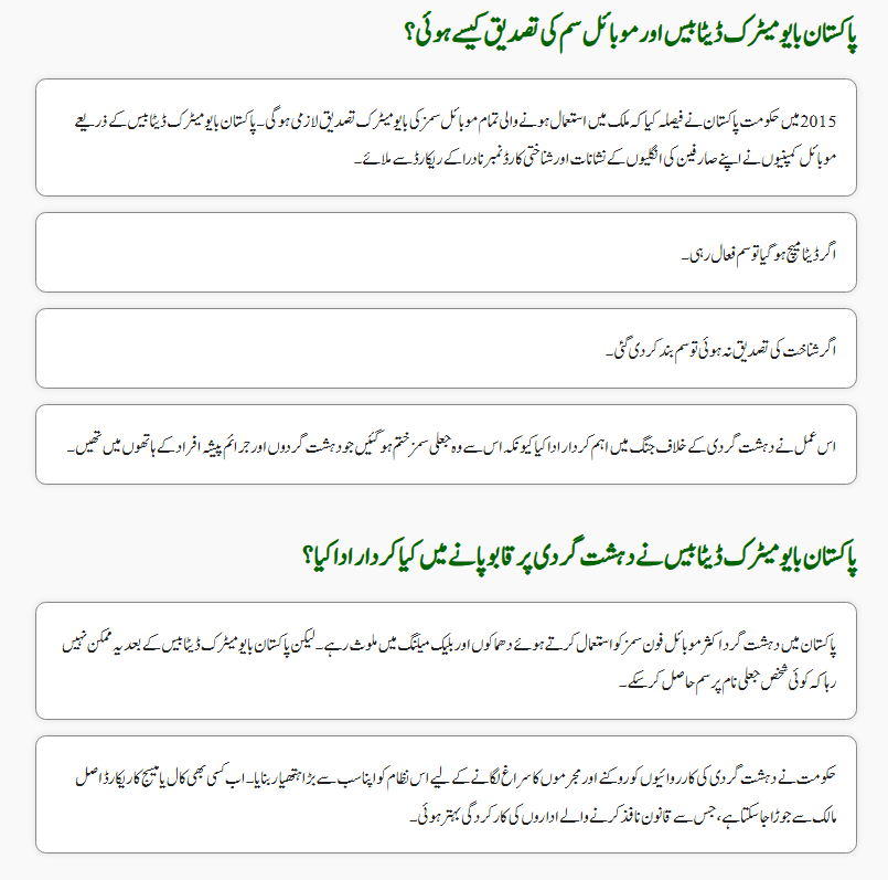 Terrorists in Pakistan often used unregistered SIMs to plan attacks and blackmail people. With the Pakistan Biometric Database, it became nearly impossible for anyone to buy a SIM card under a fake name.