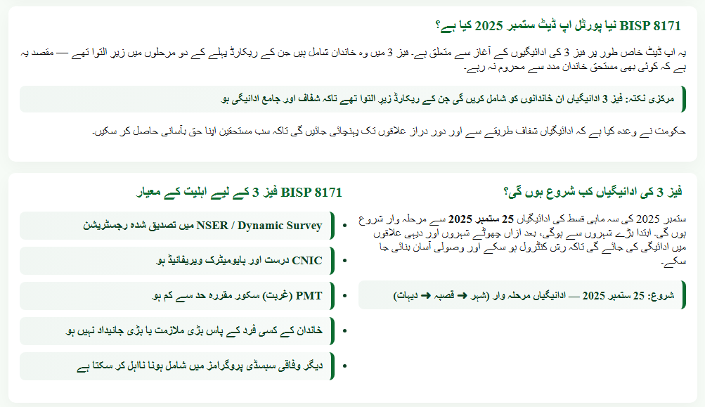 The update refers to the third round of payments under the BISP 8171 program. Phase 3 mainly includes families that were left out of earlier phases or whose data was under verification.
