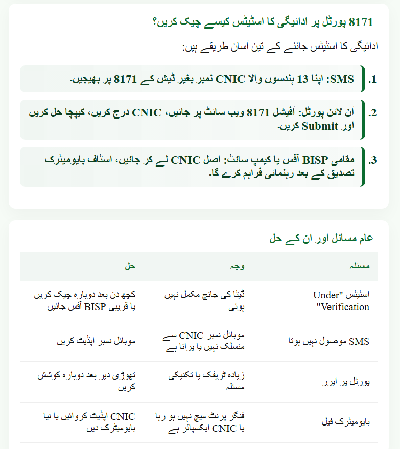 You can send your CNIC to 8171, use the online portal, or visit a local BISP office.