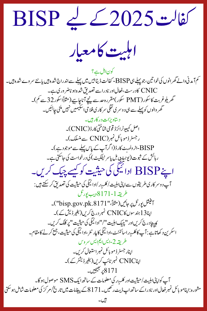 You can check your eligibility via the 8171 web portal (enter CNIC) or by sending your CNIC number via SMS to 8171.