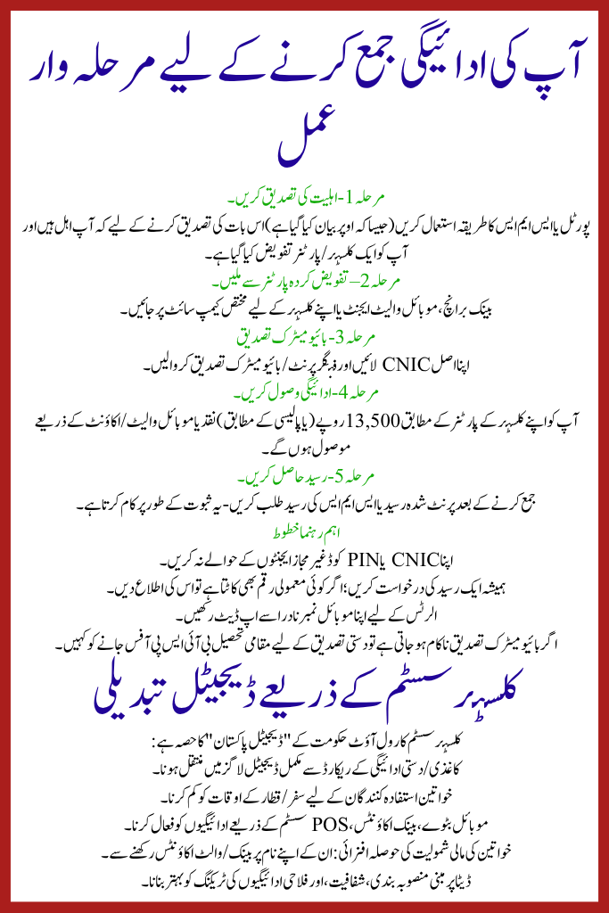 • Beneficiary Verification: At point of collection the woman presents her CNIC, does fingerprint/biometric check, and collects cash/wallet transfer.