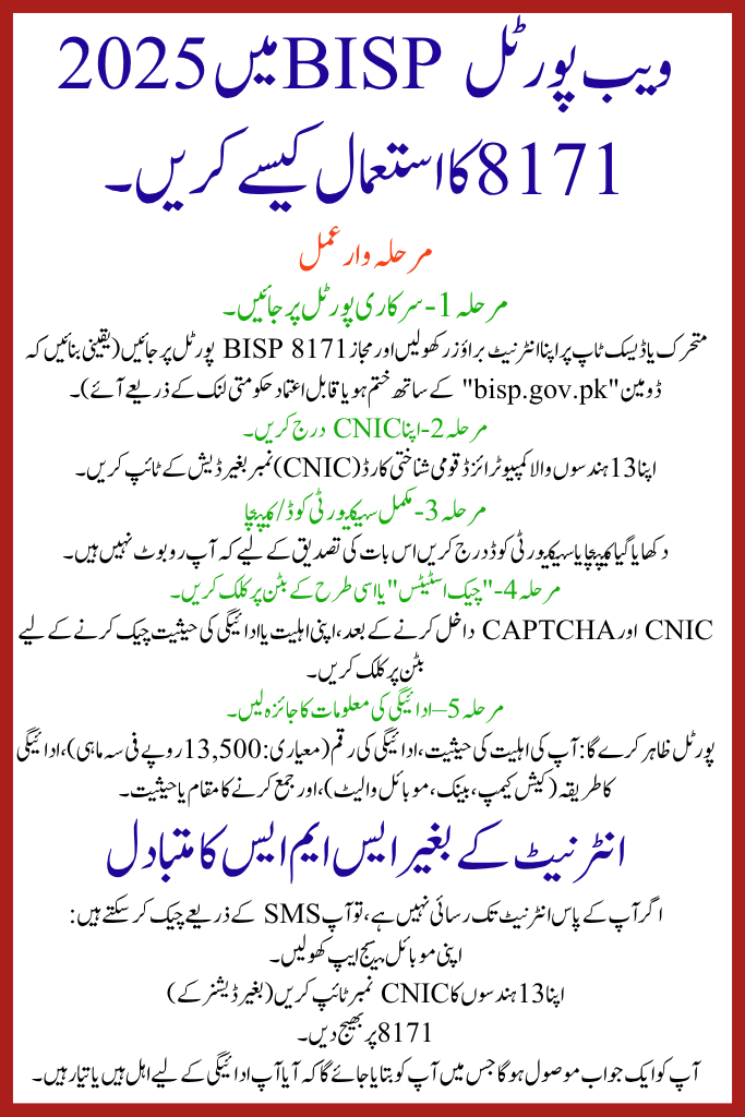 BISP Web Portal 8171Ongoing in 2025Continuous / quarterly cyclesStandard quarterly payment roughly Rs 13,500 (with special larger disbursements in some cases) Online via portal, SMS to 8171, in-person registration/verification