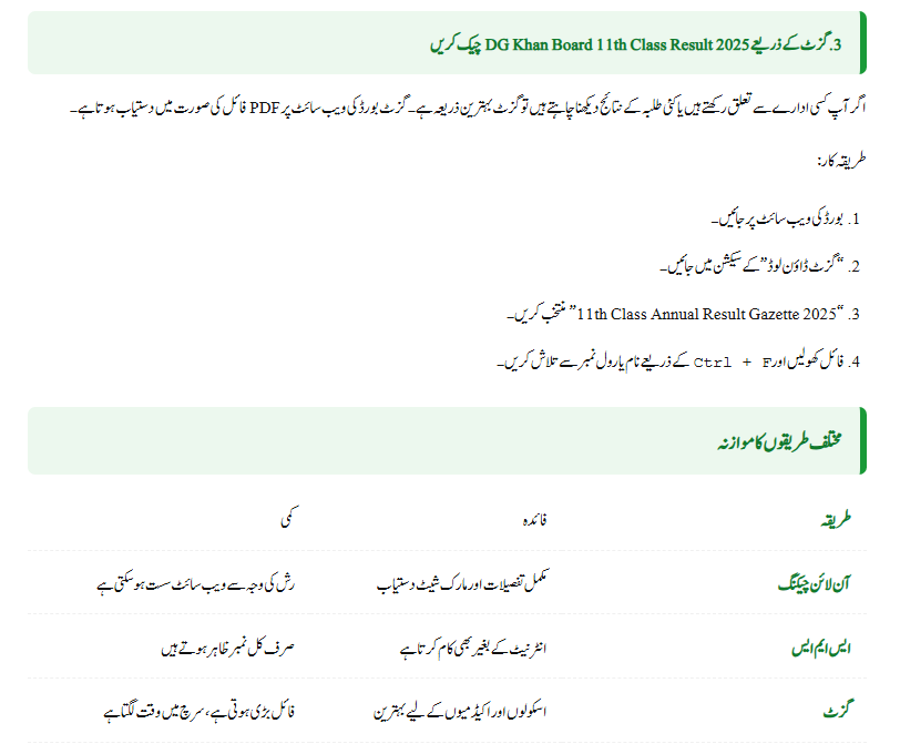 The DG Khan Board provides three easy and reliable ways for students to check their results — online, by SMS, and through the Gazette.