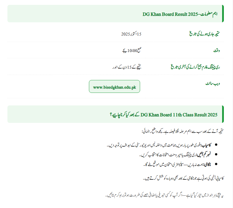 According to the official announcement, the DG Khan 11th Class Result 2025 will be released on 15 October 2025 at 10:00 AM. On result day, the board’s website may run slow due to heavy traffic, so students are advised to also use the alternative methods — SMS service or Result Gazette PDF. Keep your roll number slip ready before the result day so you can check your marks quickly and without stress.