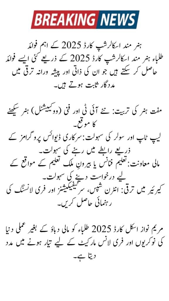 The Hunarmand Scholarship Card 2025 is part of the Maryam Nawaz Punjab skill program that provides free or subsidized advanced IT and vocational training to students. It also gives access to laptop schemes, Taleem finance, solar devices, and freelancing opportunities.